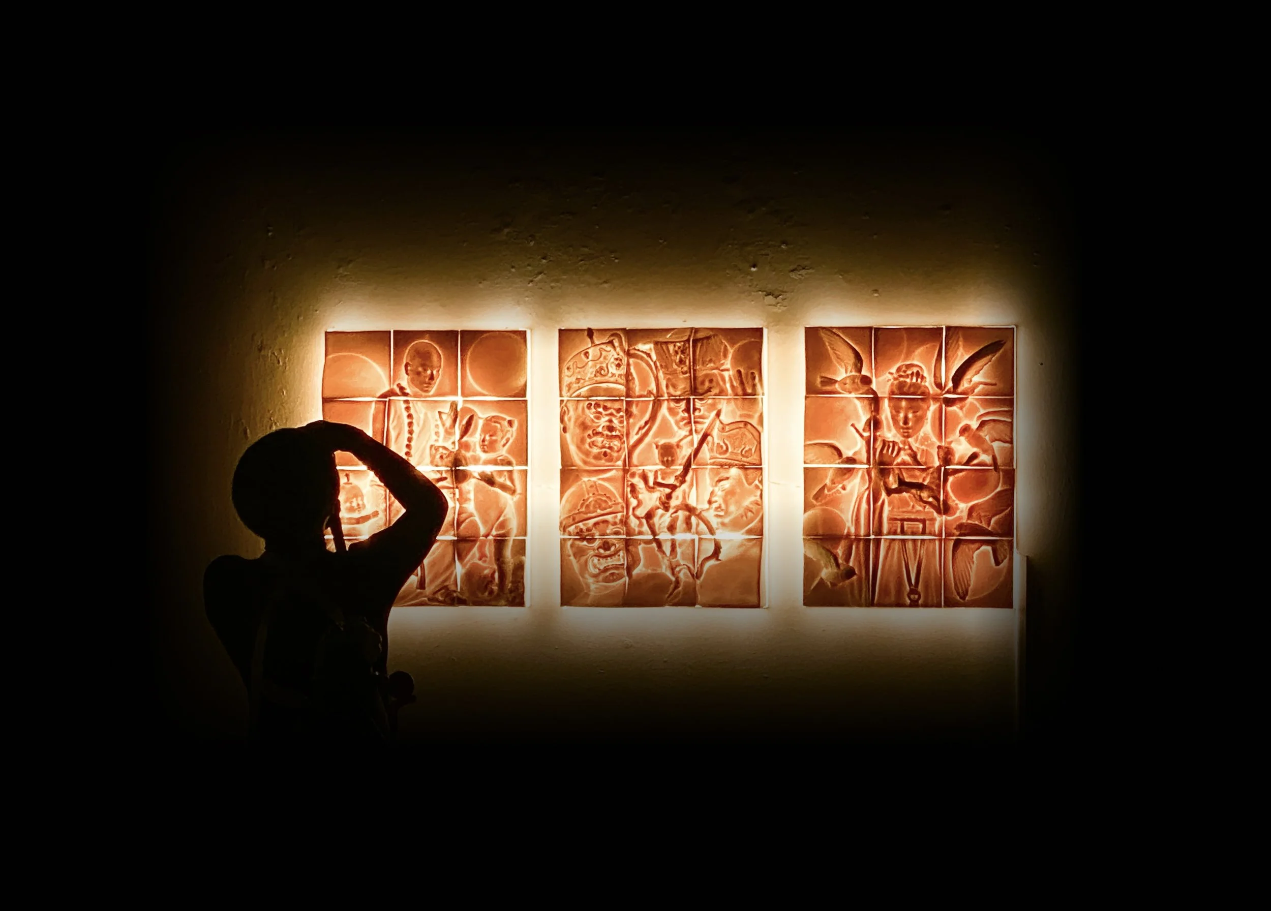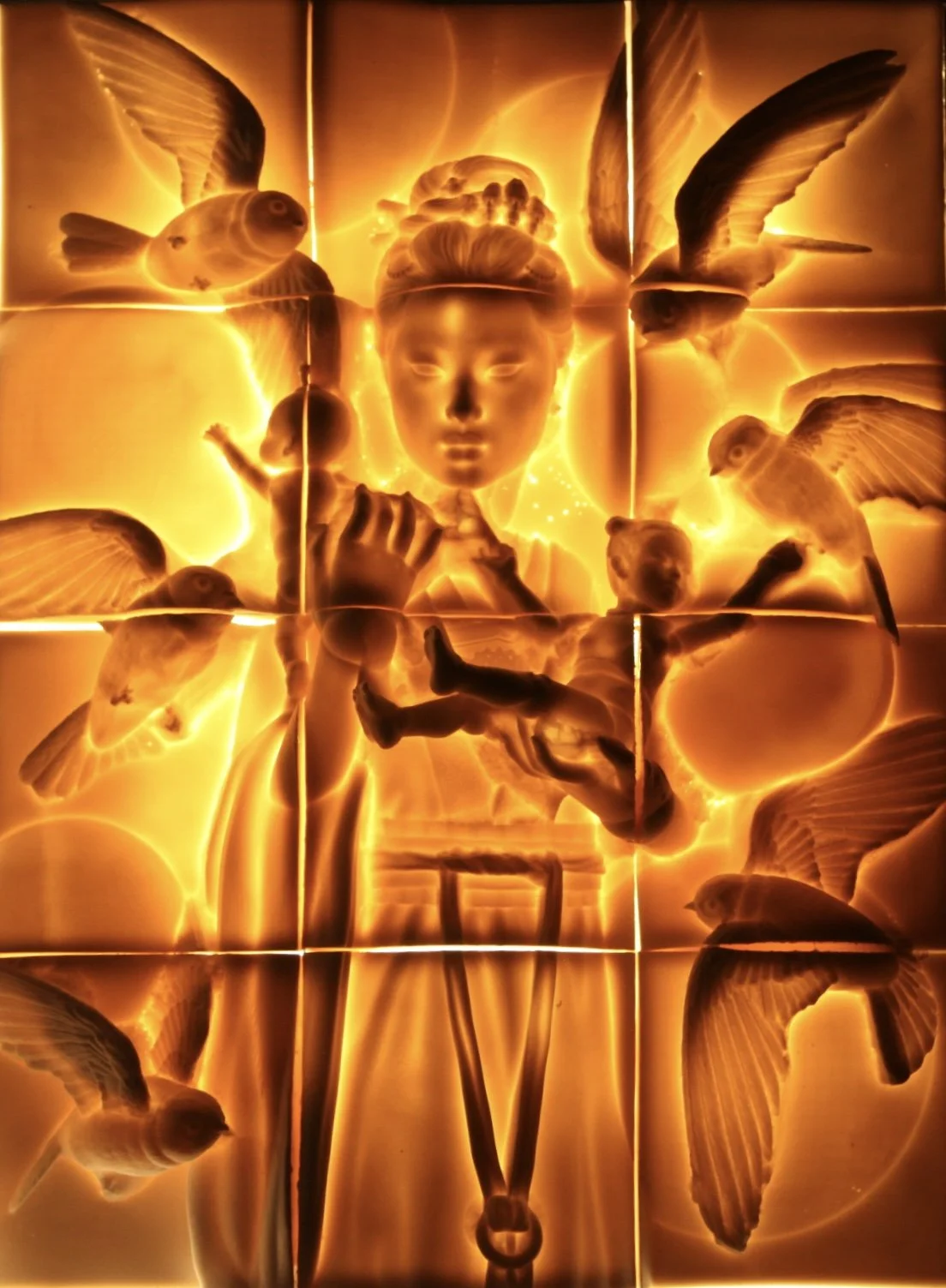 Behind each tile, hu installed LED light panels. Under natural light, the surface reveals intricate sculptural textures and rhythms; when illuminated in darkness, the work transforms—its luminous lines emerging from within, tracing the contours of the ceramic landscape like glowing rivers. In that moment, the sculpture seems alive, breathing light and shadow into a space that oscillates between the real and the ethereal.